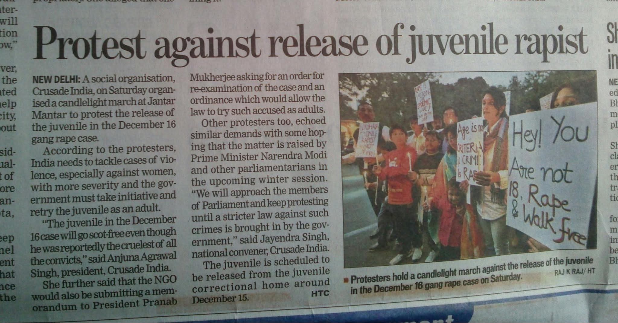 1. Conducted a massive campaign to provide Justice for Nirbhaya (Rape victim-Dec.2012). Organized candlelight march at Jantar Mantar along with a petition sent to the President of India for amendment in the Juvenile Law. Our efforts paved the way and the Juvenile Justice Amendment Bill 2015 was passed by the Parliament thereby lowering the age of juveniles to 16 years or older to be tried as adults for heinous crimes like rape and murder.